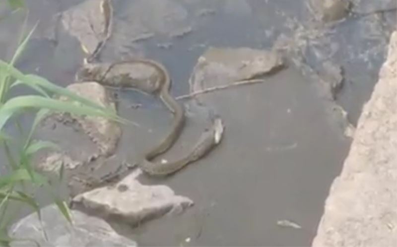 Dereiçi Mevki’inde Hidro Elektirk Santrali önünde ortaya çıkan yaklaşık 1 metrelik yılanlar, su kenarında bekleyerek karınlarını doyurmak için balık avlıyor. Yılanın balığı yakalaması ve başka bir yılana kaptırmama mücadelesi kameraya yansıdı.