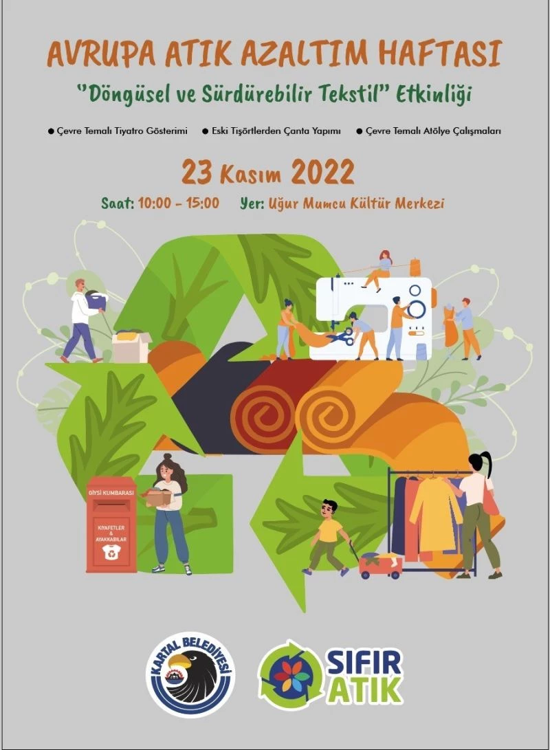 Geri dönüşümü mümkün olmayan atıkların (ambalaj atıkları, atık camlar, bitkisel atık yağlar, atık piller, atık tekstil, elektrikli ve elektronik atıklar) toplanmasını sağlayarak, cadde ve sokaklara yerleştirilen geri dönüşüm ekipmanlarına atıkların bırakılmasını sağlayan Kartal Belediyesi, Avrupa Atık Azaltım Haftası çerçevesinde de farkındalık oluşturmak ve bilinçlendirme amacıyla bir etkinlik düzenleyecek.