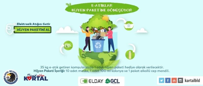 “Elektronik Atığını Getir Hijyen Paketini Al” sloganı ile düzenlenen kampanya kapsamında Kartal Belediyesi Çevre Koruma ve Kontrol Müdürlüğü’ne gelerek 35 kg e-atık malzemesini teslim eden vatandaşlara içerisinde 10 adet maske, 1 adet kolonya ve 1 paket alkollü cep mendilinin bulunduğu hijyen paketi hediye ediliyor.