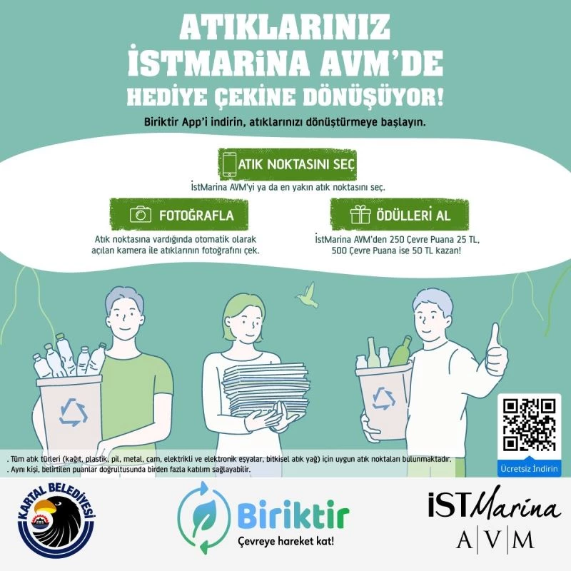 İstMarina AVM ya da Kartal ilçesindeki en yakın atık noktasını seçerek atıklarını getiren ve fotoğraflayarak Kartal Belediyesi’nin uygulamasına yollayan vatandaşlar, 250 çevre puanına 25 TL, 500 çevre puanına ise 50 TL’lik hediye çekleri kazanacak. Kazanılan hediye çekleri ise İstMarina Alışveriş Merkezi’nde kullanabilecek.