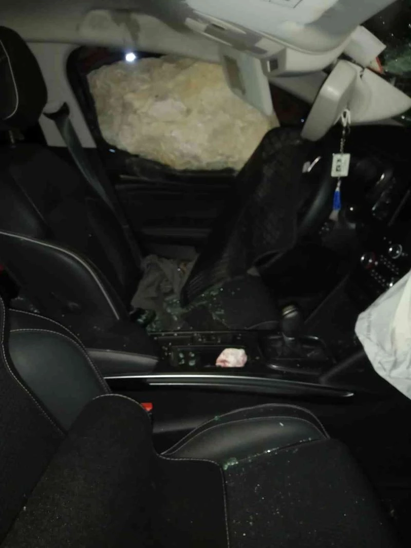 Kazada otomobil camından içeriye kaya girdi, kazada karı koca yaralandı.