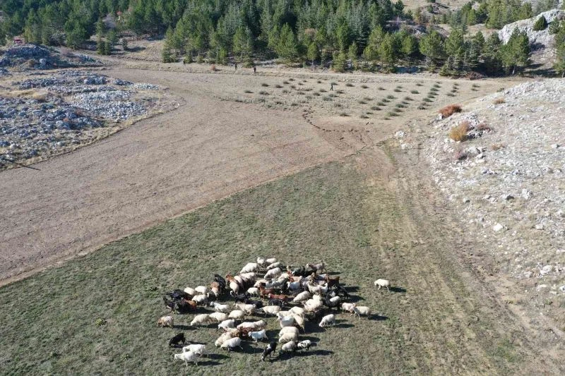 Denizli’nin Çameli ilçesinde ormanlık alanda sahibinin otlatmak için bıraktığı küçükbaşların bir kısmı kayboldu. Ekipler tarafından drone ile bulunan küçükbaşlar sahibine teslim edilirken, sürüye katılma anı havadan görüntülendi.