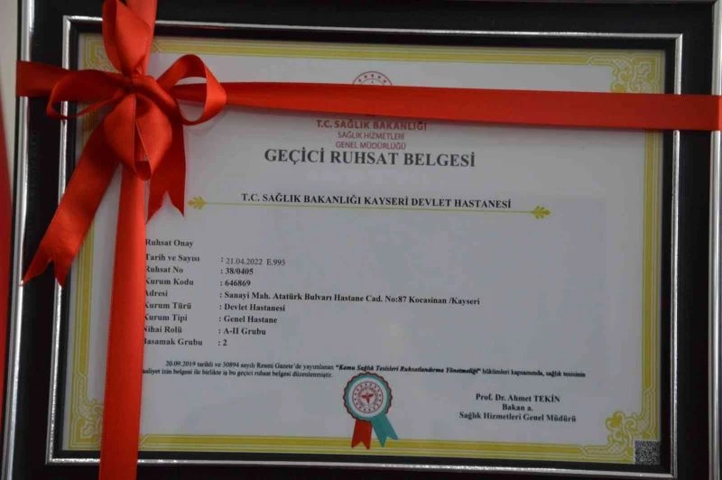 Küllerinden yeniden doğan Kayseri Devlet Hastanesi’nin bu tescil belgesi ile birlikte yürümeye başladığını dile getiren Kayseri Sağlık Müdürü Benli de; “A2 geçici ruhsat belgemizi Devlet Hastanesi Başhekimimiz Sayın Doç. Dr. İsmail Altıntop beye teslim etmiş bulunmaktayız. Bilindiği gibi Kayseri Devlet Hastanemiz tarihi olan bir hastane. Burada hizmet veren Kayseri Eğitim Araştırma Hastanesi’nin Kayseri Şehir Hastanesi’ne taşınması ile birlikte de küllerinden doğdu diyebileceğimiz hastanemizin tescili yeniden alınarak hizmete açılması sağlanmıştır. Artık emekleme sürecini bitirerek yürümeye başladı. Hastanemizde, daha nitelikli hizmetlerin verilmesi adına bu tür belgelerin alınması ve kademe olarak büyümesi gerekiyor. Bu yolda bir aşamayı daha geçmiş bulunuyoruz. Şehrimize sağlık alanında nitelikli hizmetler kazandırmak adına çalışmalarımız aralıksız devam ediyor. Bize bu konuda destek veren başta sağlık bakanımız ve milletvekillerimiz olmak üzere emeği geçen tüm devlet büyüklerimize teşekkür ediyorum” diye konuştu.