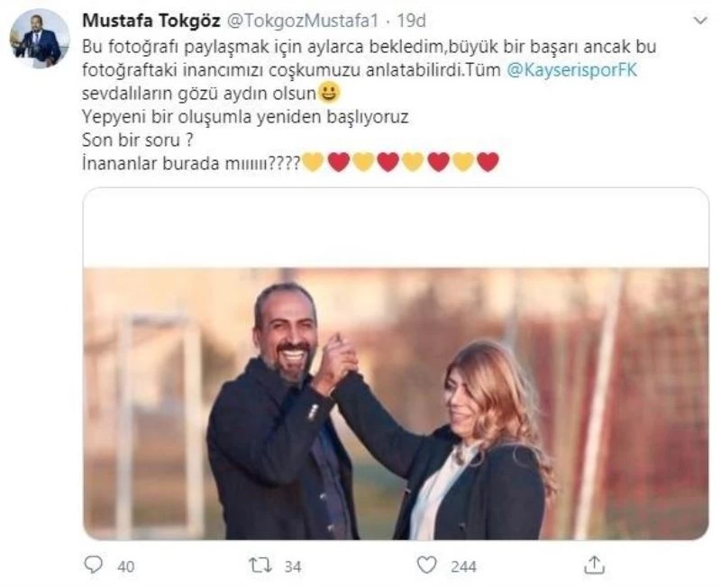 Tokgöz sosyal paylaşım sitesi Twitter’den Kulüp Başkanı Berna Gözbaşı ile birlikte fotoğrafını paylaşarak, "Bu fotoğrafı paylaşmak için aylarca bekledim, büyük bir başarı ancak bu fotoğraftaki inancımızı coşkumuzu anlatabilirdi. Tüm @Kayserispor FK sevdalıların gözü aydın olsun. Yepyeni bir oluşumla yeniden başlıyoruz. Son bir soru? İnananlar burada mı?" ifadelerine yer verdi.
