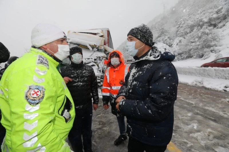 Soğuk ve yağışlı havanın olumsuzlukları da beraberinde getirdiğini belirten Vali Kaldırım, Sakarya’da uzun zamandan beri ilk defa böyle yoğun bir yağışın meydana geldiğini ifade etti. Zorunlu olmadıkça bugünlerde yolculuk yapılmamasını, zorunlu olanların da çok daha dikkatli olması gerektiğine dikkat çeken Vali Çetin Oktay Kaldırım, karla mücadele çalışmaları ve yol açma çalışmaları kapsamında tüm İlçe Kaymakamlarının, tüm Belediye Başkanlarının, Karayolları, AFAD, Kızılay gibi tüm birimlerin ve ekiplerin her an sahada olduğunu, herkesin bugünlerde büyük bir özveriyle çalıştığını sözlerine ekledi. Bir süre yoldaki çalışmaları inceleyen ve kazadan etkilenenlere geçmiş olsun temennisinde bulunan Vali Kaldırım, yolun açılmasının ardından ekiplere başarılar dileyerek olay yerinden ayrıldı. Yaklaşık 2 saat ulaşıma kapalı kalan Adapazarı istikametinde, trafik normal seyrine döndü.
