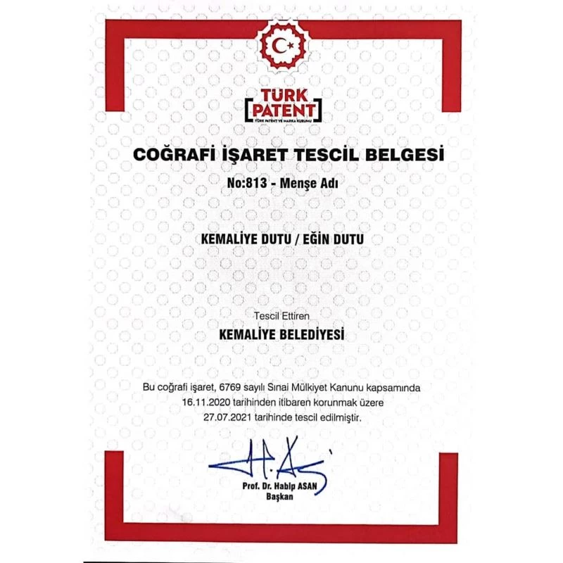 Kemaliye (Eğin) dutu, Türk Patent ve Marka Kurumu tarafından tescillenerek coğrafi işaretini aldı.