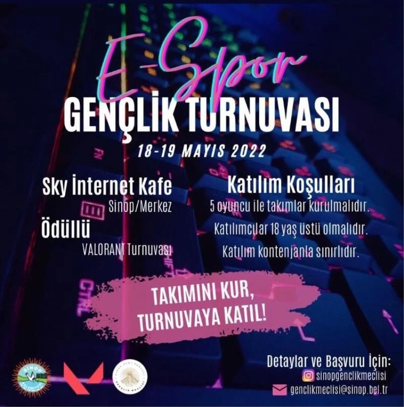 Sinop Belediyesi Kent Konseyi Gençlik Meclisi’nin düzenlediği ‘E-Spor Gençlik Turnuvası’ duyurusu yapıldı. 18-19 Mayıs tarihlerinde düzenlenecek ödüllü ‘Valorant turnuvası’ için, katılım şartı ise yalnızca 18 yaş üzeri 5 kişilik takım kurmak. Başvuru ve detaylar hakkında bilgi almak için Kent Konseyi Gençlik Meclisi iletişim kanalları üzerinden ulaşılabileceği bildirildi.