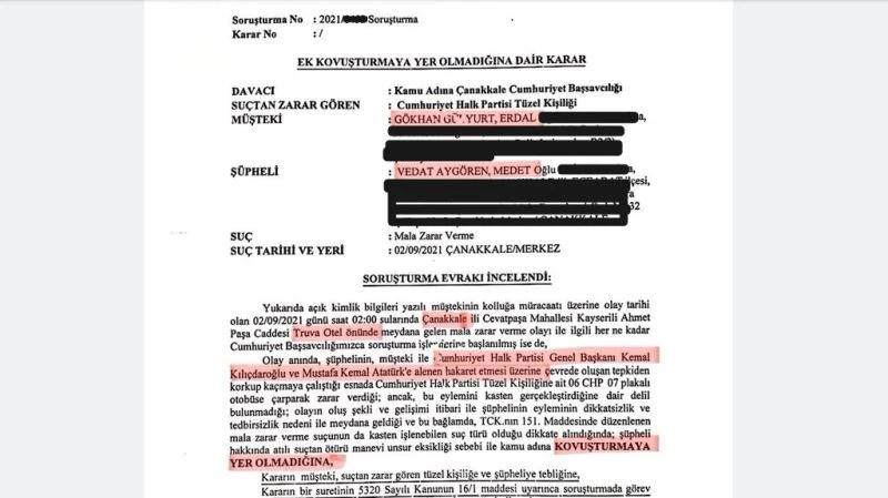 Aynı gece Çanakkaleli Vedat Aygören’in CHP Genel Başkanı Kemal Kılıçdaroğlu’na hakaret ettiği iddiasıyla avukatlar aracılığı ile Çanakkale Cumhuriyet Başsavcılığına şikayette bulunulmuştu. Otobüs şoförü G.G. ile CHP İl Kadın Kolları Başkanı Sibel Erol’un ifadelerinde Vedat Aygören’in Kılıçdaroğlu’na hakaret etmediği ortaya çıktı. Bunun üzerine Cumhuriyet Savcılığı tarafından yapılan açıklamada, “Türk Ceza Kanunu’nun 125. maddesinde düzenlenen gıyapta hakaret suçunun oluşabilmesi için hakaret fiilinin en az 3 kişi ile ihtilat ederek işlenmesi gerektiği, somut olayda söz konusu ihtilat unsurunun gerçekleşmediği anlaşılmakla, şüpheli hakkında kovuşturma yapılmasına yer olmadığına karar verilmiştir” denildi.