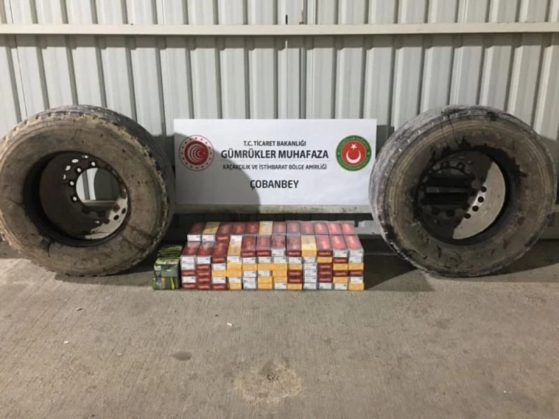 Kilis’in Elbeyli ilçesi Çobanbey Gümrük Kapısında, Suriye’den Türkiye’ye giren tırın lastiklerinde yapılan aramada, bin 400 paket kaçak sigara ele geçirildi.