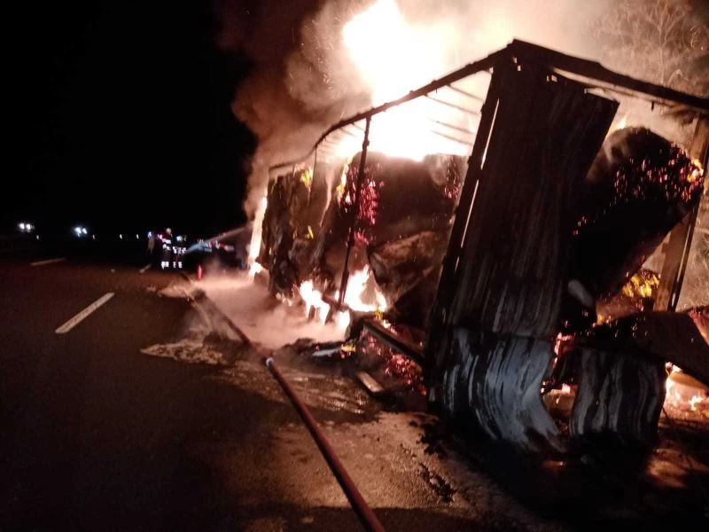İtfaiye ekiplerinin güçlükle söndürdüğü yangında tır kullanılmaz hale geldi.