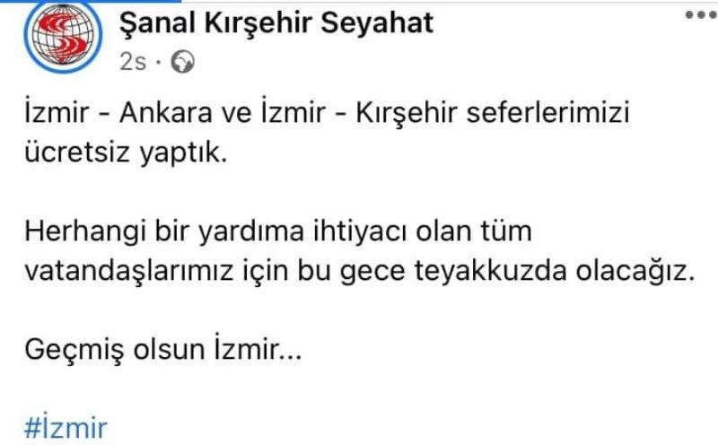 Firma yetkilileri sosyal medya hesaplarından yaptıkları duyuruda, "İzmir -Ankara ve İzmir Kırşehir seferlerimizi ücretsiz yaptık. Herhangi bir yardıma ihtiyacı olan vatandaşlarımız için gece boyu teyakkuzda olacağız" notuyla kamu oyunu bilgilendirdi. Kırşehir merkezli Türkiye genelinde faaliyet gösteren firma yetkilisi Yılmaz Şanal, "İzmir’den Kırşehir’e gelen seyahatlerimizi ücretsiz hale çektik. Pazar akşamı son seferimize kadar ücret alınmayacak. Ülke genelinde 35 noktada faaliyet yürütüyoruz. Depremlerde dil, din, ırk farkı gözetmeden paylaşmanın önemine inanıyoruz" dedi.