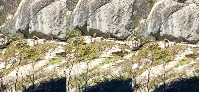 Ulus ilçesinin Ulukaya kanyonunda yer alan Ulukaya şelalesini gezmeye giden iki arkadaş kayalıkların arasında bir ayı olduğunu fark etti. Hemen cep telefonuna sarılan iki arkadaş ayıyı uzak bir mesafeden cep telefonu ile görüntülediler.