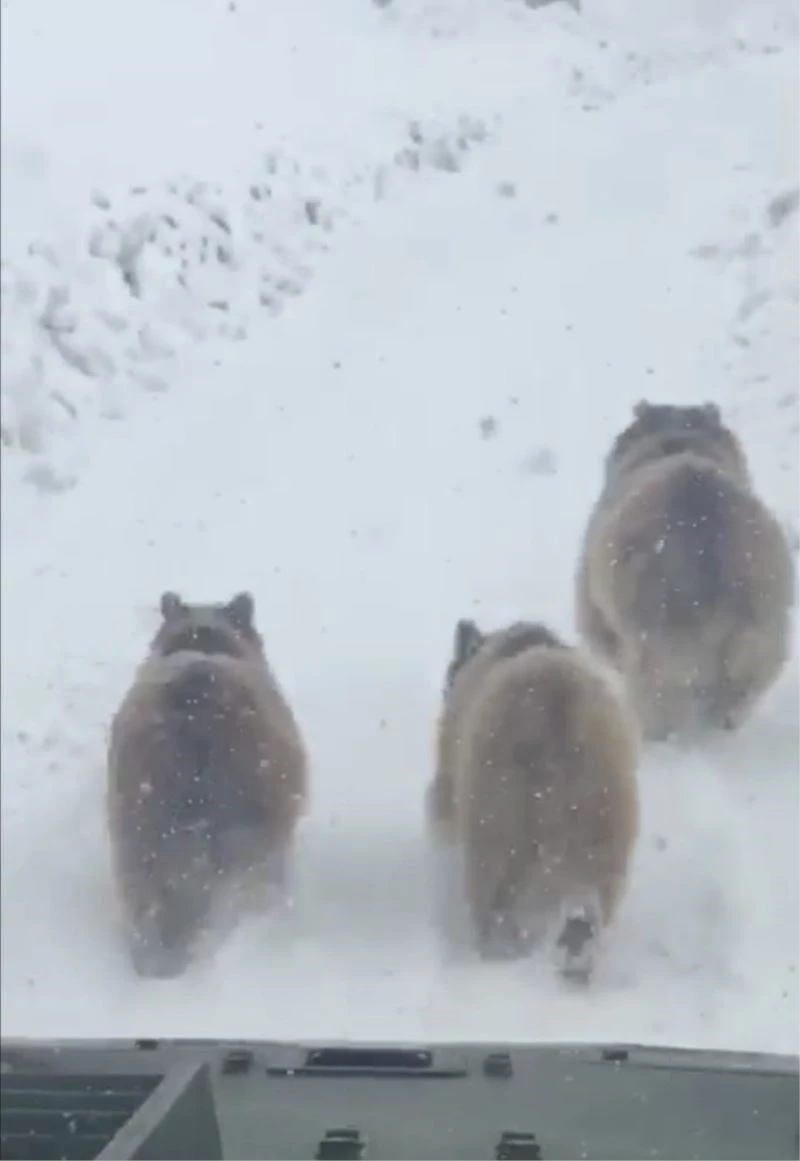 Kış uykusundan uyanan ayı ve yavruları şaşırttı