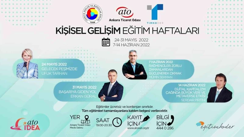 Ankara Ticaret Odası’nın (ATO), Türkiye Odalar ve Borsalar Birliği (TOBB) ve Tesisat İnşaat Sanayi Malzemeciler Derneği ile birlikte düzenlediği “Kişisel Gelişim Eğitim Haftaları” 24 Mayıs’ta başlıyor.