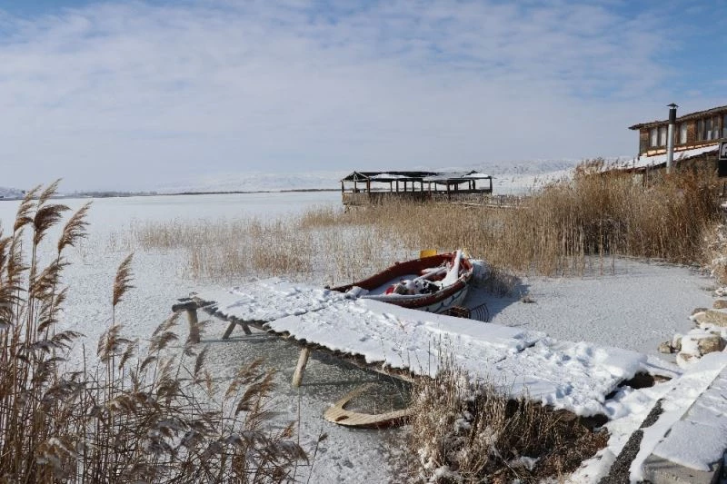 Sivas’ta soğuk havanın etkisiyle kısmen buz tutan Tödürge Gölü’ndeki eşsiz manzara havadan görüntülendi.
