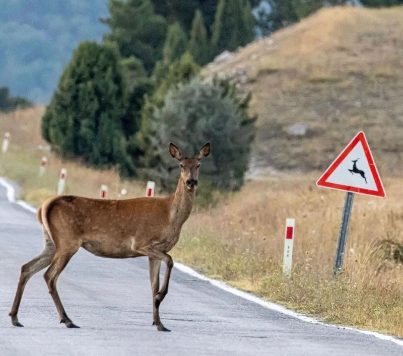Kızıl Geyik ‘Geyik çıkabilir’ tabelası önünde görüntülendi