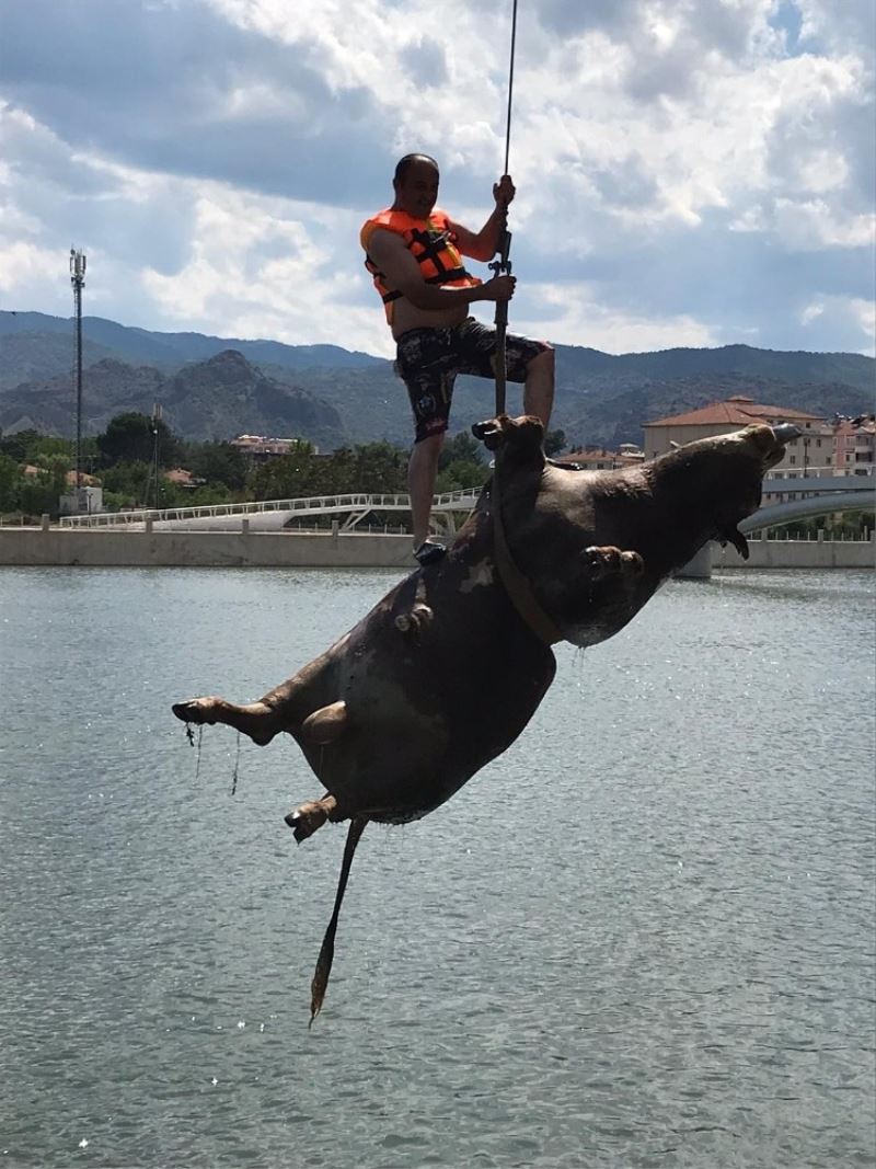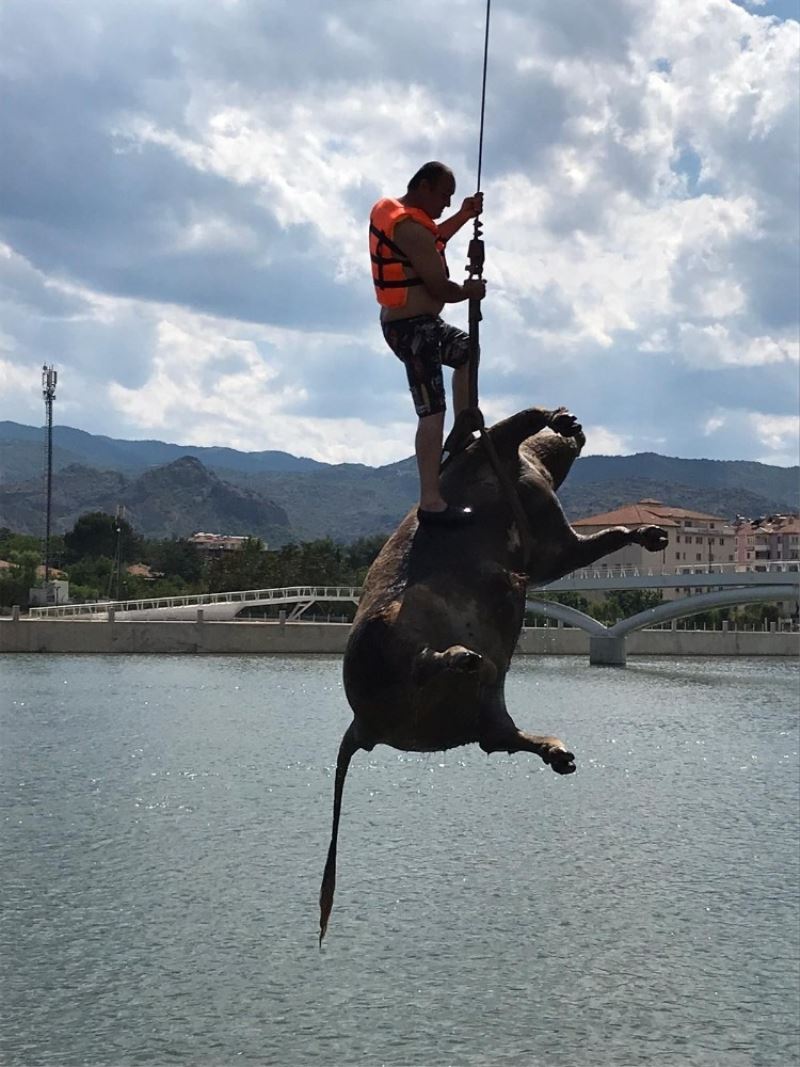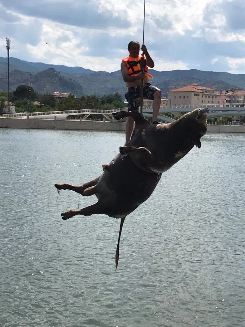 Osmancık ilçesinde yaklaşık 4 gündür Kızılırmak Nehri içinde büyük baş hayvan ölüsü bulunuyordu. Çevreye koku yayan hayvan leşi Belediye İtfaiye Müdürlüğü ekipleri tarafından vinç yardımı ile sudan alındı.