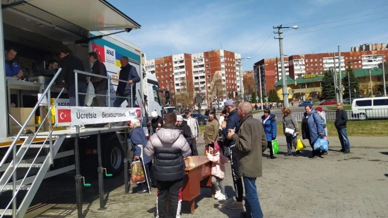 Ukrayna’da yaşayanlara destek olmak için harekete geçen Kocaeli Büyükşehir Belediyesi, mobil yemek tırını bölgeye göndermişti. Kocaeli Büyükşehir Belediyesi’nin kısa bir süre önce Antikkapı A.Ş.’nin bünyesine kattığı mobil yemek tırında, 2 ton temiz su tankı, 1 ton atık su tankı, bağımsız 5 gün çalışabilecek jeneratör bulunuyor. Ukrayna’nın Lviv kentinde Afet ve Acil Durum Yönetimi Başkanlığı (AFAD) bünyesinde faaliyet gösteren tır, günlük 1200 kişiye 3 çeşit yemek veriyor.