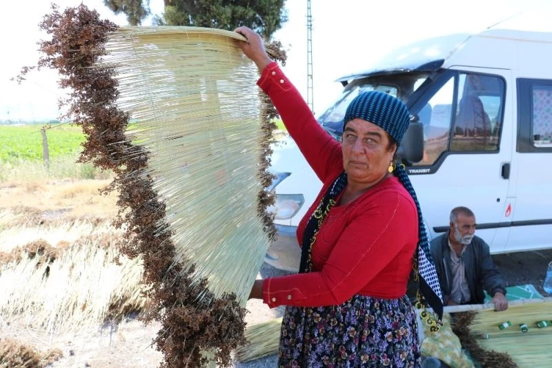 Adana ve Osmaniye’deki sulak alanlardan topladıkları topuk otu çubuklarını Kahramanmaraş’a getiren konargöçerler, topladıkları çubukları önce kurutuyor, daha sonra iple örerek sergi haline getiriyor. Yüzlerce çubuğun oluşmasıyla ortaya çıkan yaklaşık 4 metre uzunluğundaki sergi ise 30-40 liradan satılıyor.