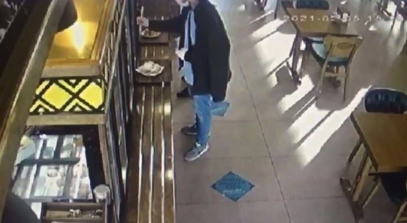 Kırık kolla hırsızlık anları güvenlik kameralarına yansıdı. Görüntülerde, kadının masada çantasını unutup gitmesi ve kolu alçılı kişinin masaya oturması görülüyor. Şüpheli unutulan çantayı bacaklarının arasına alarak uzaklaşıyor.
