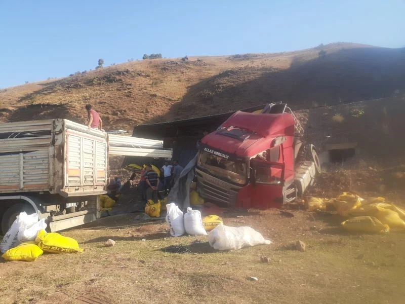 Tırın kaza yapmasıyla birlikte yemler yola savrulurken, sürücü yara almadan kazayı atlattı.