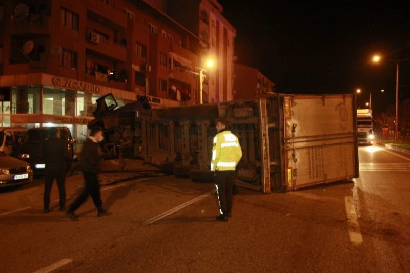 Kaza sabaha karşı saat 04.20 sıralarında Orhangazi’de meydana geldi. Alınan bilgilere göre Bursa’daki bir depodan yüklediği ve içinde tekstilden elektronik eşyaya kadar bir çok depo malzemesinin bulunduğu Mustafa Altuntaş (54) idaresindeki 34 DL 8738 plakalı TIR Orhangazi’de İznik kavşağını geçtikten sonra henüz belirlenemeyen bir nedenle kontrolden çıktı.