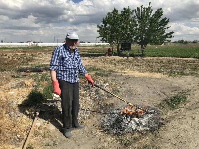 Korona virüs tedbirleri kapsamında sokağa çıkması kısıtlananlardan 80 yaşındaki Mevlüt Çetin, vaktinin çoğunu bahçesinde tamir ve düzenleme gibi işlerle geçiriyor. Bulunduğu bölgenin son müstakil evlerinden birinde oturan Mevlüt Çetin, kimi zaman bahçesinde sebzelerine bakarken; kimi zaman da bahçe aletlerine ağaç dallarından sap yapıyor. Isıttığı dalları düzleştirip kurutan Mevlüt Çetin, dalları keser, bel ve kürek gibi aletlere takmaya hazır hale getiriyor.