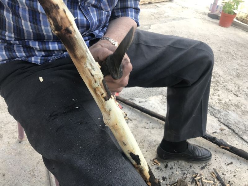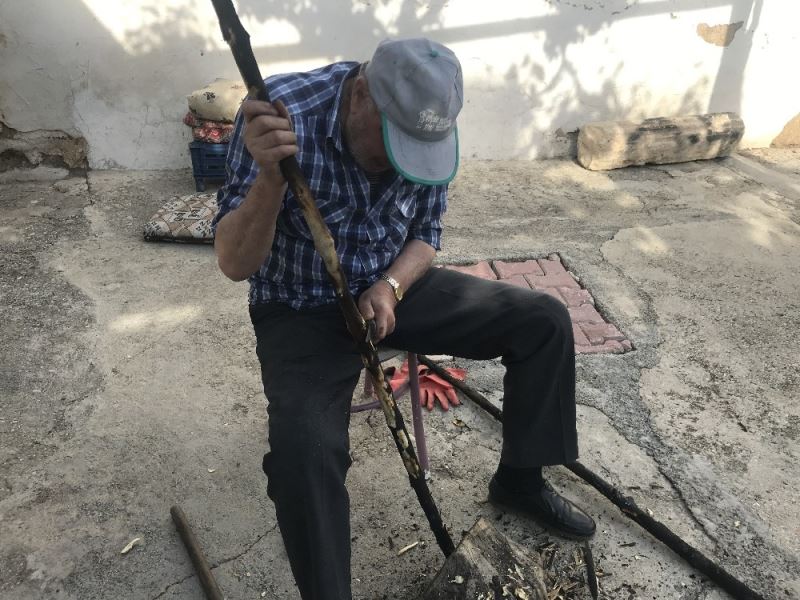El işleri ile küçüklüğünden beri sevdiği işler olduğunu ifade eden Mevlüt Çetin, etraftan bulduğu dalları kestikten sonra yakarak kürek, tırmık, keser sapı yapacağını ifade etti.