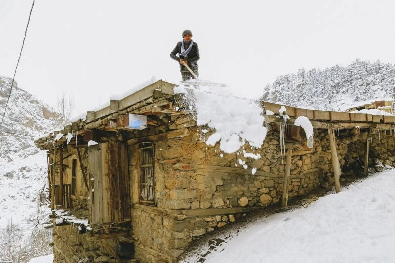 İki gündür aralıklarla devam eden kar yağışı ilçeyi beyaz örtüyle kapladı. Kar yağışının etkisini yitirmesinin ardından taş mimarili evlerin damlarına çıkan aileler, saatler süren kar temizliği yaptı. Toprak damın çökmesini önlemek amacıyla sürekli kar temizliği yapan aileler, evlerine su sızmaması için de yörede “yuvak” olarak bilinen ve toprağı sıkıştırmaya yarayan taş silindirleri kullanıyor. İlçe sakinlerinden Salih Ağıröz (28) yaptığı açıklamada, kış mevsiminin ilçede Aralık, Ocak ve Şubat aylarında yoğun olarak yaşandığını söyledi. Kar yağışının nimet ve bereket olduğunu ifade eden Ağıröz, “Atalarımız eskiden ‘Mart’ta olur yaylanın karı’ derlerdi. Gerçekten de doğruymuş. Biz iki üç tane çiçek açtı diye bahar geldi zannetmiştik ama Mart’ın 27’sindeyiz 20 santim kar var. Evlerimiz toprak damlı olduğu için günlerimizi böyle geçiriyoruz. Biz bahar gedi sanmıştık ama Mart’ta geldi kışın hası” diye konuştu.