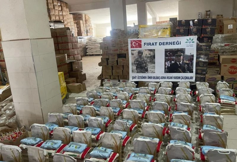 Şehit Üsteğmen Ömer Delibaş adına hazırlanan yardım tırında kuru bakliyat, çeşitli gıda maddeleri, giyim eşyaları, ayakkabı ve temel ihtiyaç malzemeleri bulunuyor.