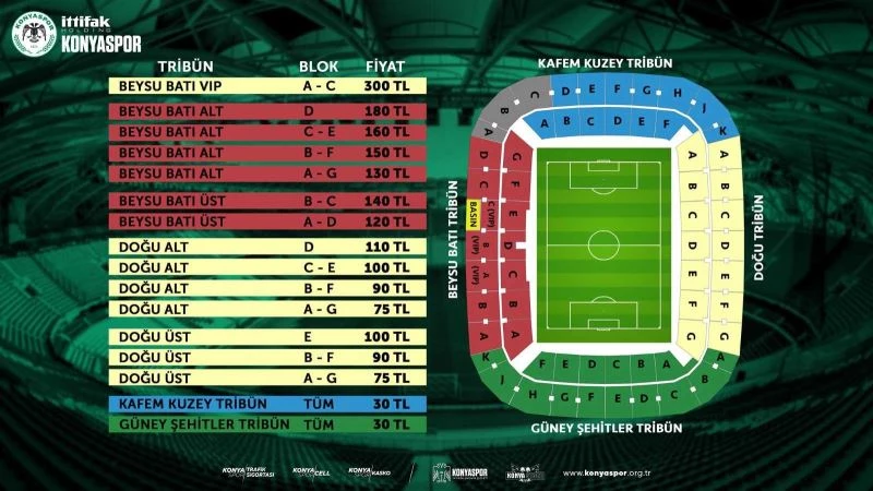 Konyaspor’un, Alanyaspor ile oynayacağı karşılaşmanın biletleri satışa çıkıyor. Konya Büyükşehir Stadyumu’nda Cumartesi günü saat 13.30’da başlayacak karşılaşmanın elektronik biletleri 29 Eylül Çarşamba günü saat 11.00 itibariyle satışa sunulacak. Bu karşılaşma biletlerinde kadın taraftarlara özel yüzde 50 indirim uygulanacak. Yeşil-beyazlı kulüpten yapılan açıklamada indirimin sadece gişeden ve kadın taraftarın kendisinin alması koşulu ile uygulanacağı, internetten ve mobil uygulamadan indirimin söz konusu olmayacağı bildirildi.