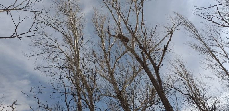 Sivas’ta köpeklerden korkup kaçarak ağaca tırmanan vaşak görenlerde şaşkınlığa neden oldu.