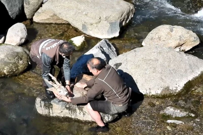 Artvin’de köpeklerinin kovaladığı yaralı karaca dereye düştü, Milli Parklar görevlileri buz gibi suya girerek, boğulmaktan olan karacayı kurtardı. Sudan çıkartıları karacaya dakikalarca kalp masajı yapan ekiler, her şeye rağmen hayata döndürmeyi başaramadı.