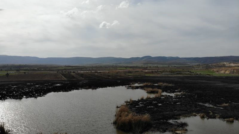 Türkiye’nin en önemli doğal kuş cennetleri arasında yer alan ‘Gölünyazı’da bulunan sazlık alanda yangın çıktı. Yangının ardından kül olan kuş cenneti havadan görüntülendi.