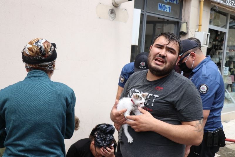 İtfaiye ekiplerinin yanan evde soğutma işlemi yaptığı sırada V.Ö., evde yavru kedilerin olduğunu söyledi. Eve giren ekipler dumanların arasından ‘Bulut’ ve ‘Pamuk’ isimli yavru kedileri kurtararak V.Ö.’ye teslim etti. Kedilerini kucağına alan V.Ö. ik kediye de su içirerek sakinleşmelerini sağladı.