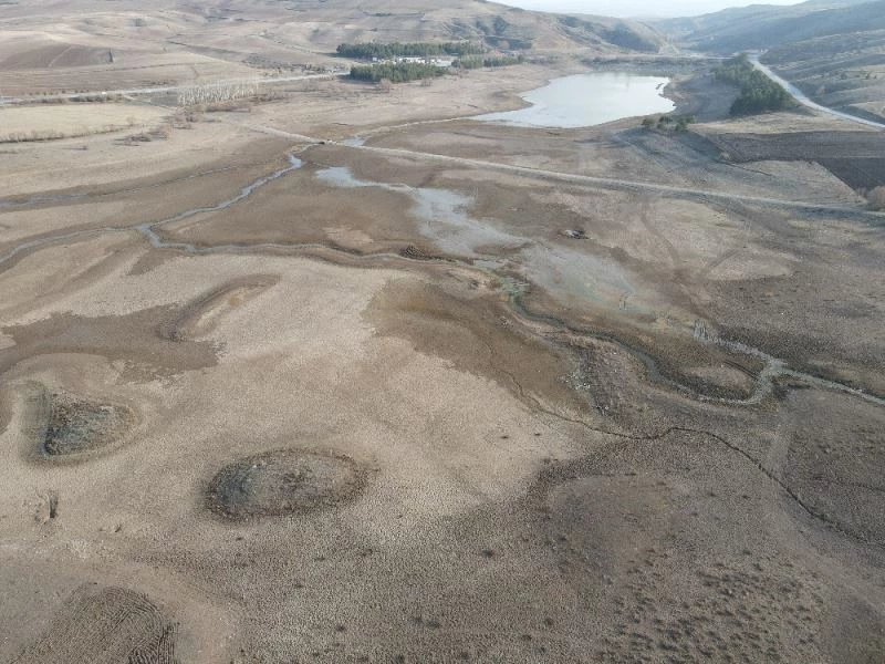 Yaklaşık 35 yıl önce yapılan gölette son yılların en düşük su seviyesi yaşanıyor. Gölette yaşanan bölgedeki çiftçileri endişelendirirken, kuraklığın ürkütücü boyutları havadan görüntülendi.