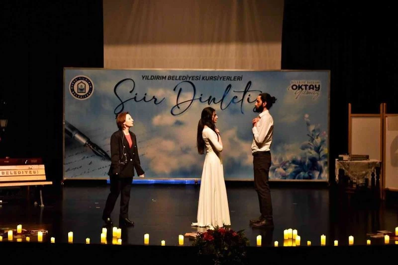 Yaygın Eğitim Programı kapsamında Drama Eğitimcisi Ayfer Yiğit Saraçoğlu tarafından verilen 4 aylık kursun sonunda 25 kursiyer, düzenlenen şiir gecesi ile hünerlerini sergiledi. Hazırlanan mizansen ağırlıklı ‘Şiir Dinletisi’nde kursiyerler Sezai Karakoç’tan Nazım Hikmet’e, Necip Fazıl’dan Ahmet Arif’e, Mevlana’dan Abdurrahim Karakoç’a büyük şairlerin eserlerini yorumladı. ‘Yıldırım Belediyesi Kursiyerleri Şiir Dinletisi’ programı sanatseverlerden büyük beğeni topladı.