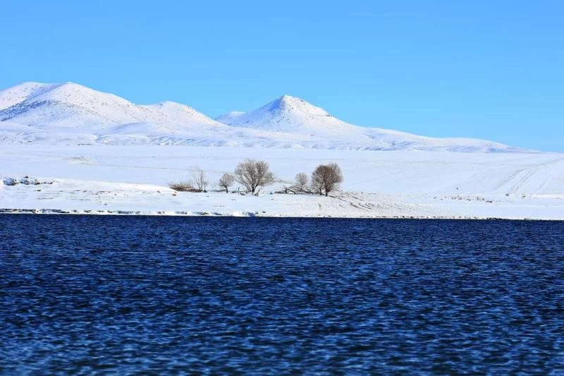 İç Anadolu’nun plajı olarak bilinen Savcılı Plajı’nın minyatürü haline gelen Kurutlu Sahili, karla beraber kartpostallık görüntüler oluşturdu.