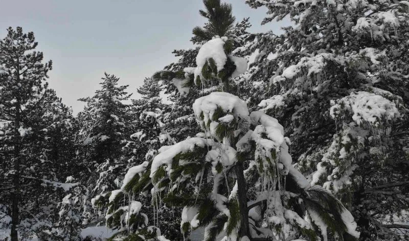 Kütahya’da karlı ve buzlu çam ağaçları ilginç görüntüler oluşturdu.