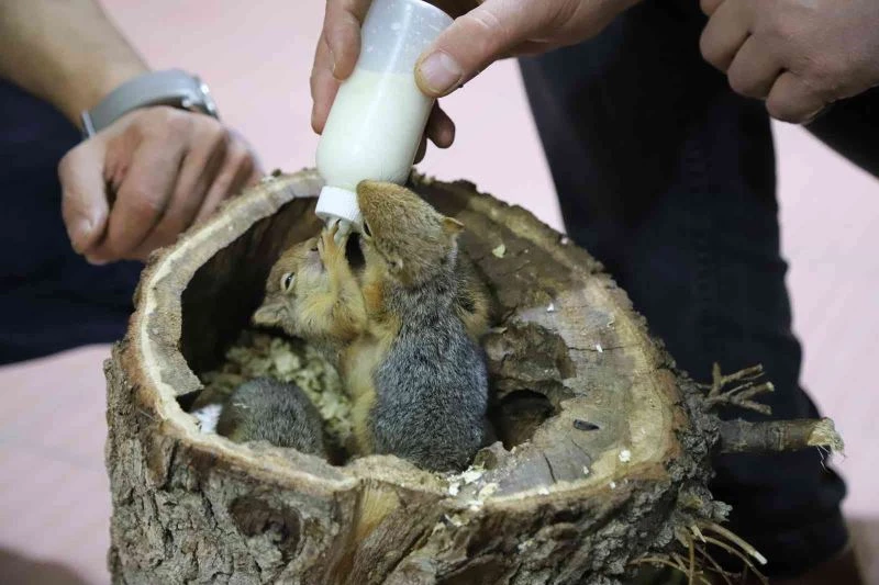 Kütükten çıkan 3 sincap yavrusu biberonla besleniyor