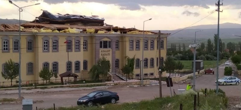 Sivas’ın Gemerek ilçesinde etkili olan kuvvetli rüzgar adalet sarayının çatısını uçurdu.