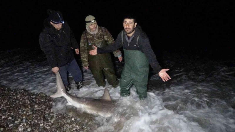 Antalya’nın Manavgat ilçesinde Alara Çayı’nın denize döküldüğü yerde balık tutan vatandaşların oltasına 2 metre boyunda yaklaşık 150 kilogram ağırlığında köpekbalığı takıldı. Dev bir kuzu balığı yakaladıkları umuduyla makinaya sarılan balıkçılar, gördükleri manzara karşısında şaşkına döndü.