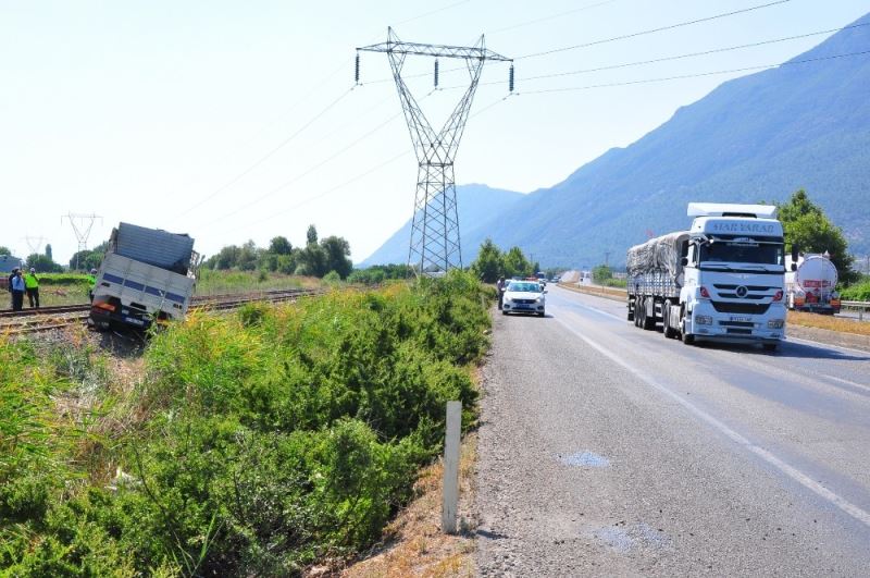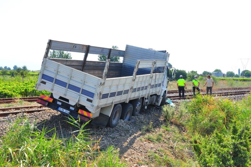 Manisa’da seyir halindeyken lastiği patlayan kamyon karşı şeride geçerek, tren raylarının üzerine çıktı. Şans eseri kazada ölen ya da yaralanan olmadı.