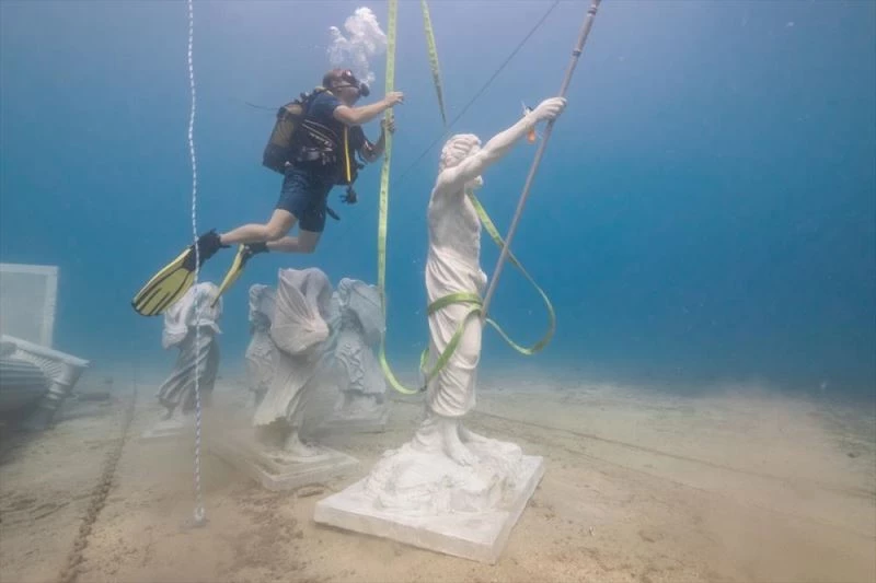 Deniz altındaki yaklaşık 10 dönüm alanı kapsayacak sanat parkında ziyaretçilerin beğenisine sunulacak Likya'nın kaybolmuş ve unutulmuş 658 eseri dalgıçlar tarafından özenle suya indirildi.