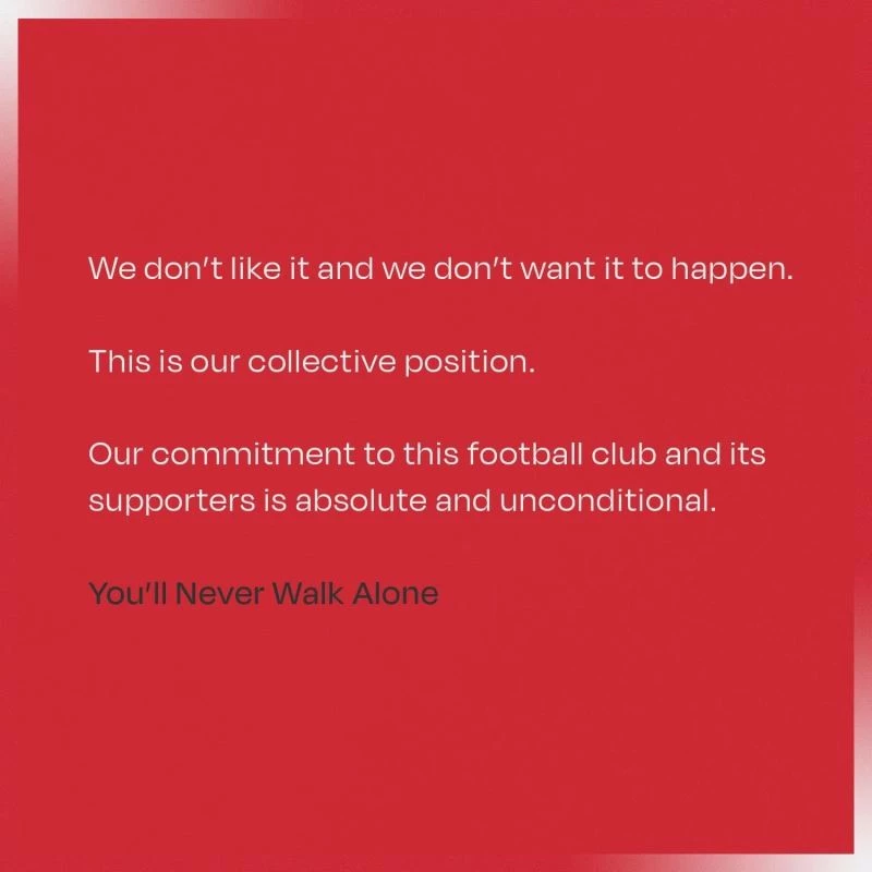 İngiliz ekibi Liverpool’da futbolcular ortak bir paylaşımda bulundu ve Avrupa Süper Ligi’ni istemediklerini ifade etti. Futbolcular yaptığı açıklamada, "Sevmedik ve gerçekleşmesini istemiyoruz. Takım olarak ortak görüşümüz. Kulübe ve taraftara olan bağlılığımız sorgusuzdur ve koşulsuzdur. Asla yalnız yürümeyeceksiniz" dedi.