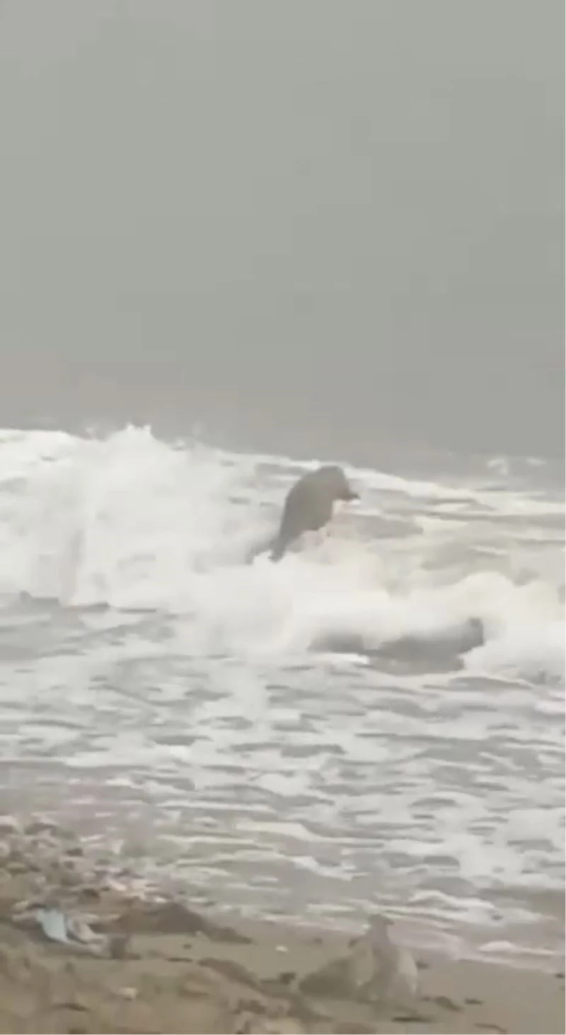 Lodosta karaya vuran su samuru karnının doyururken görüntülendi