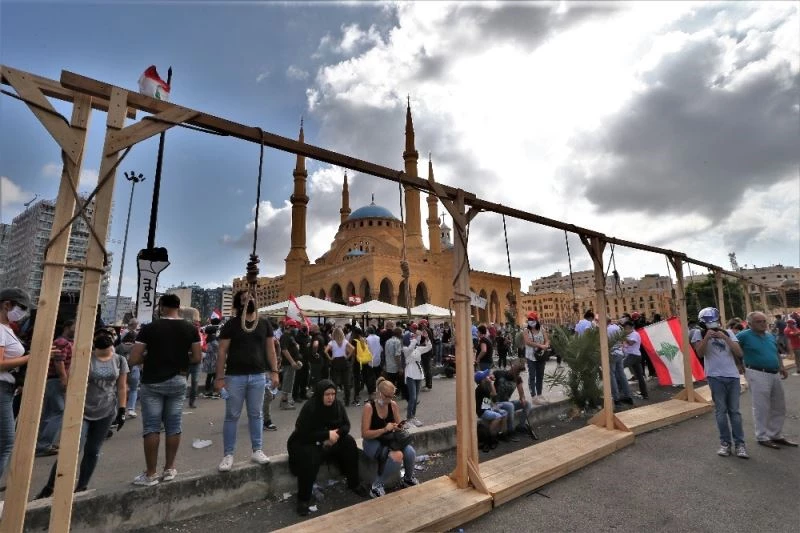 Lübnan’ın başkenti Beyrut, 4 Ağustos’ta limanın 12 numaralı deposunda bulunan 2 bin 750 ton amonyum nitratın patlaması sonucu meydana gelen facianın ardından yaralarını sarmaya çalışıyor. Ekonomik krizin giderek derinleştiği ülkede protestocular bu kez patlamada ihmali bulunduğu gerekçesiyle hükümeti suçlarken, gösterilere de devam ediyor. Başkent Beyrut’ta devam eden gösterilerde protestocular Şehitler Meydanı’nda bir araya gelerek hükümetin istifasını talep etti. Öfkeli protestocular, politikacılar için meydanın ortasına temsili dar ağacı kurdu.