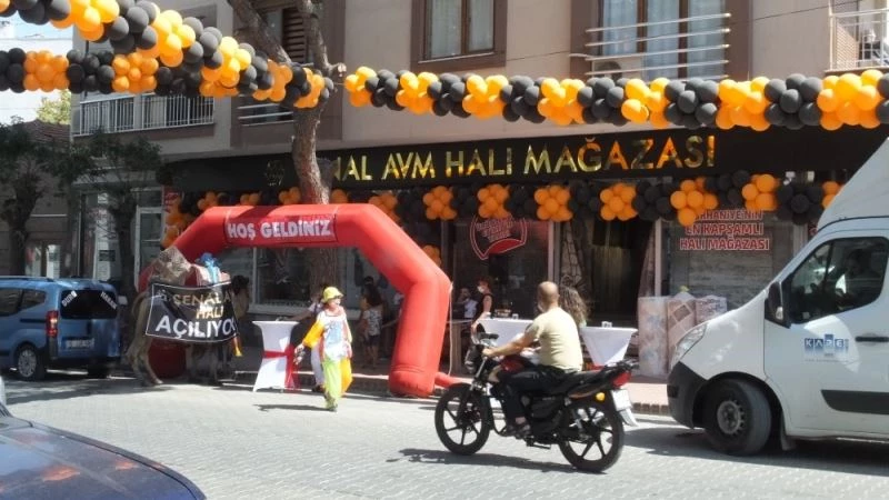 Balıkesir’de açılışı yapılan halı mağazasının açılışına işletme sahibi deve getirerek açılışı öyle yaptı.