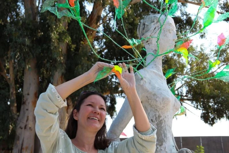 Yaklaşık bir hafta önce atıkları birleştirerek heykel yapımını başlayan Amirova, heykelin üst kısmına da yeniden yeşeren ağaçları temsilen renkli atık şişelerden yaptığı dalları ekledi.