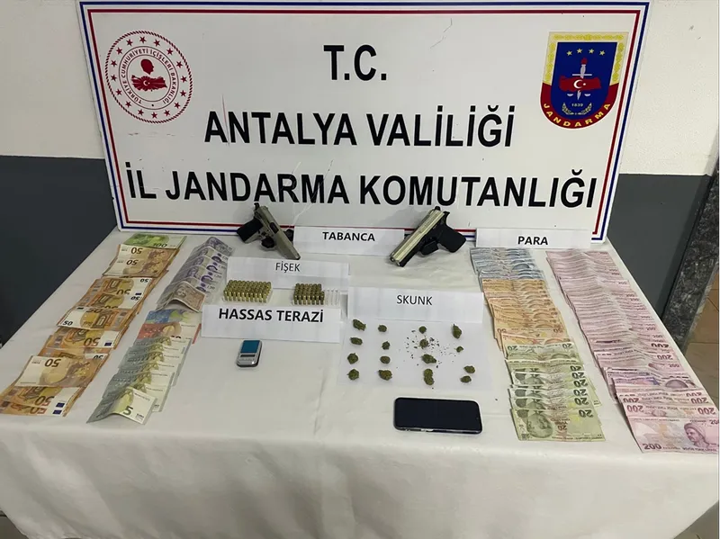 Şüpheli R.U.'nun ev ve iş yerinde gerçekleştirilen aramada, 50 gram skunk, bir hassas terazi, 2 adet ruhsatsız tabanca, 82 fişek ve suçtan elde edildiği değerlendirilen bir miktar para ele geçirildi.